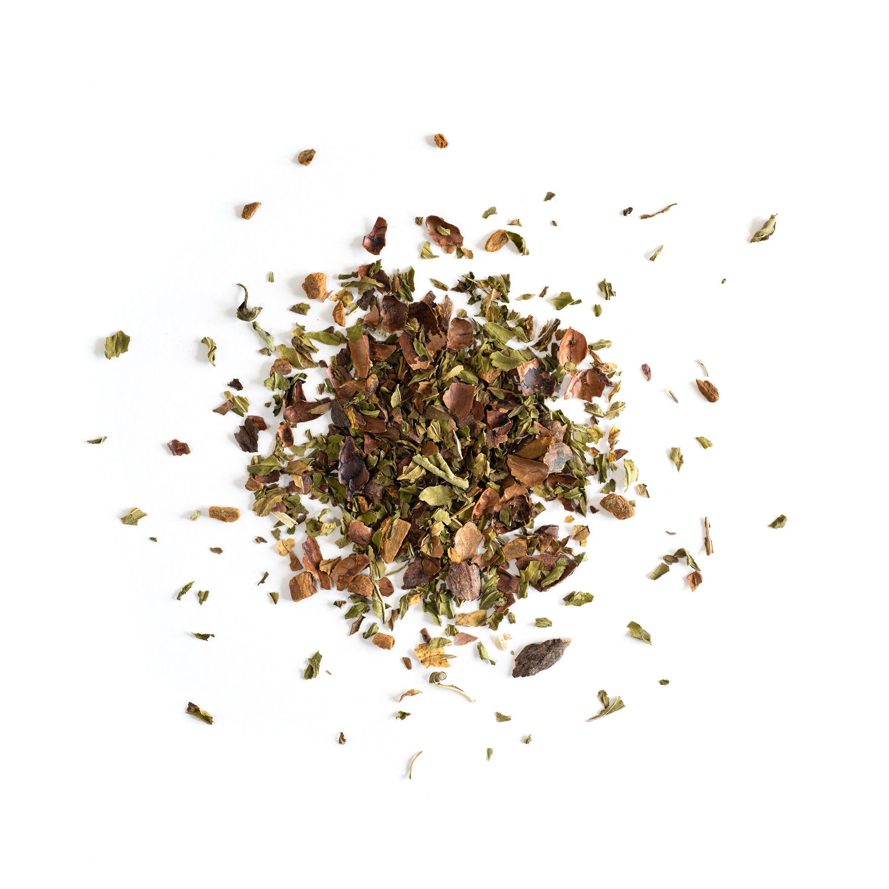 A charming dessert fusion of rich chocolate, cool mint, warm cinnamon and sweet whole leaf stevia. Warming in the winter and refreshing in the summer. More than a dessert blend, mint and cinnamon soothe the stomach while cacao enriches the heart.